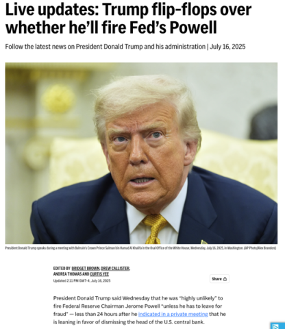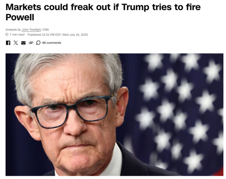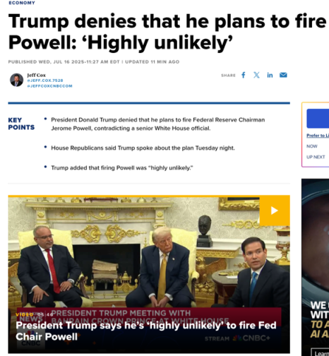事实上,媒体已经注意到了特朗普在是否罢免鲍威尔问题上的摇摆不定。美联社报道称,虽然特朗普7月16日表示不会解雇鲍威尔,但就在不到24小时前,他刚刚在一次私人会议上表示有意解雇鲍威尔。特朗普的这种态度,其实正是由于他非常清楚解雇鲍威尔所可能引发的震荡。