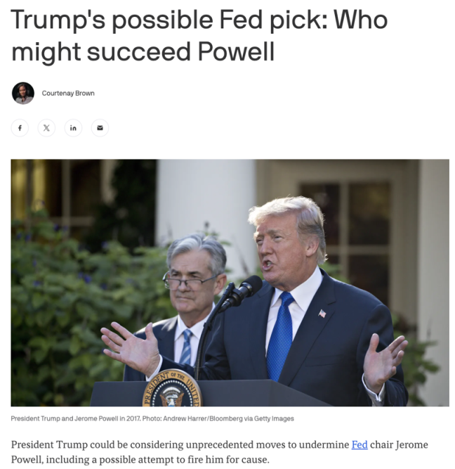 △美国时政新闻网站AXIOS详细分析了特朗普可能挑选的美联储主席人选,该话题已成为全美舆论热点。